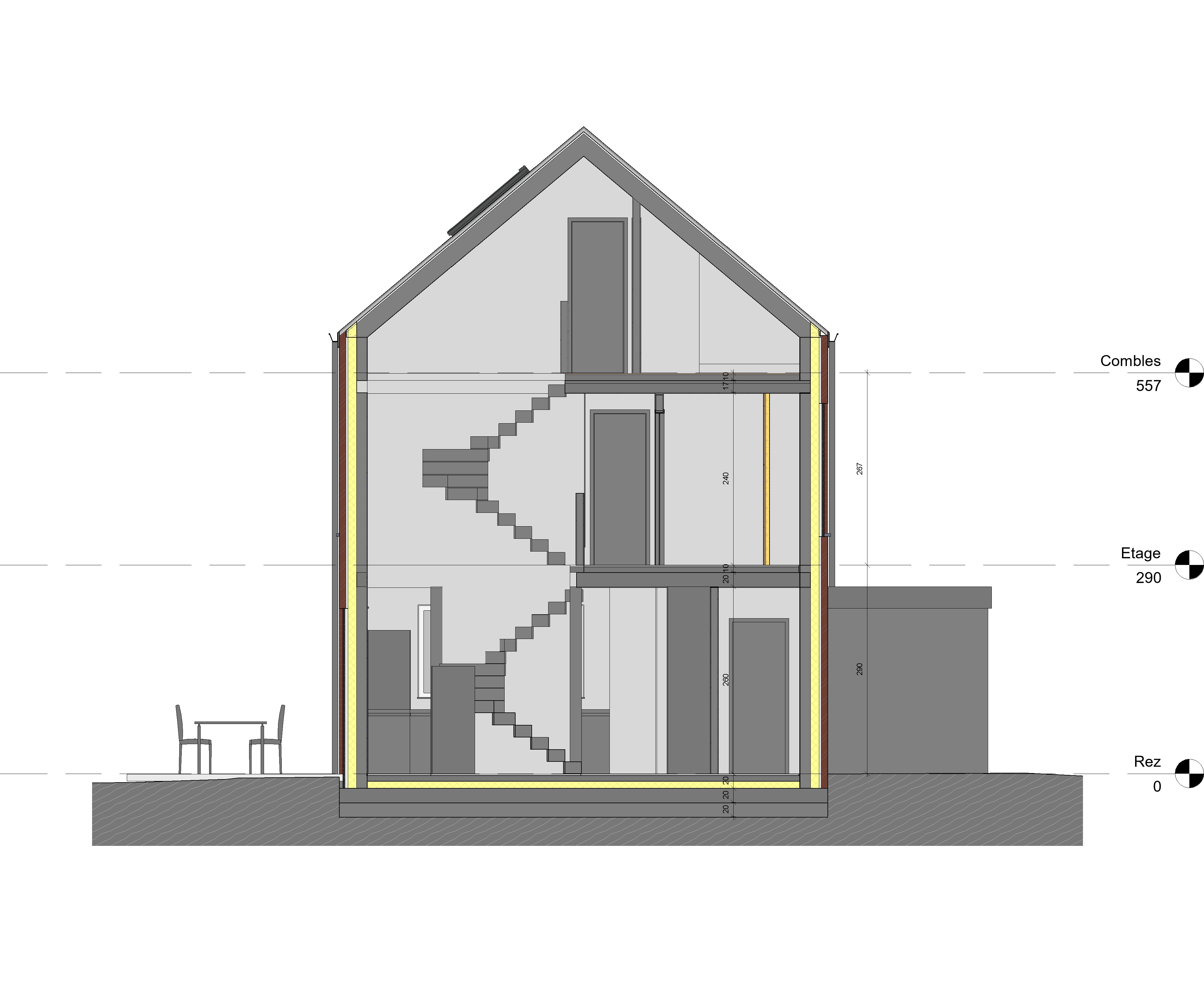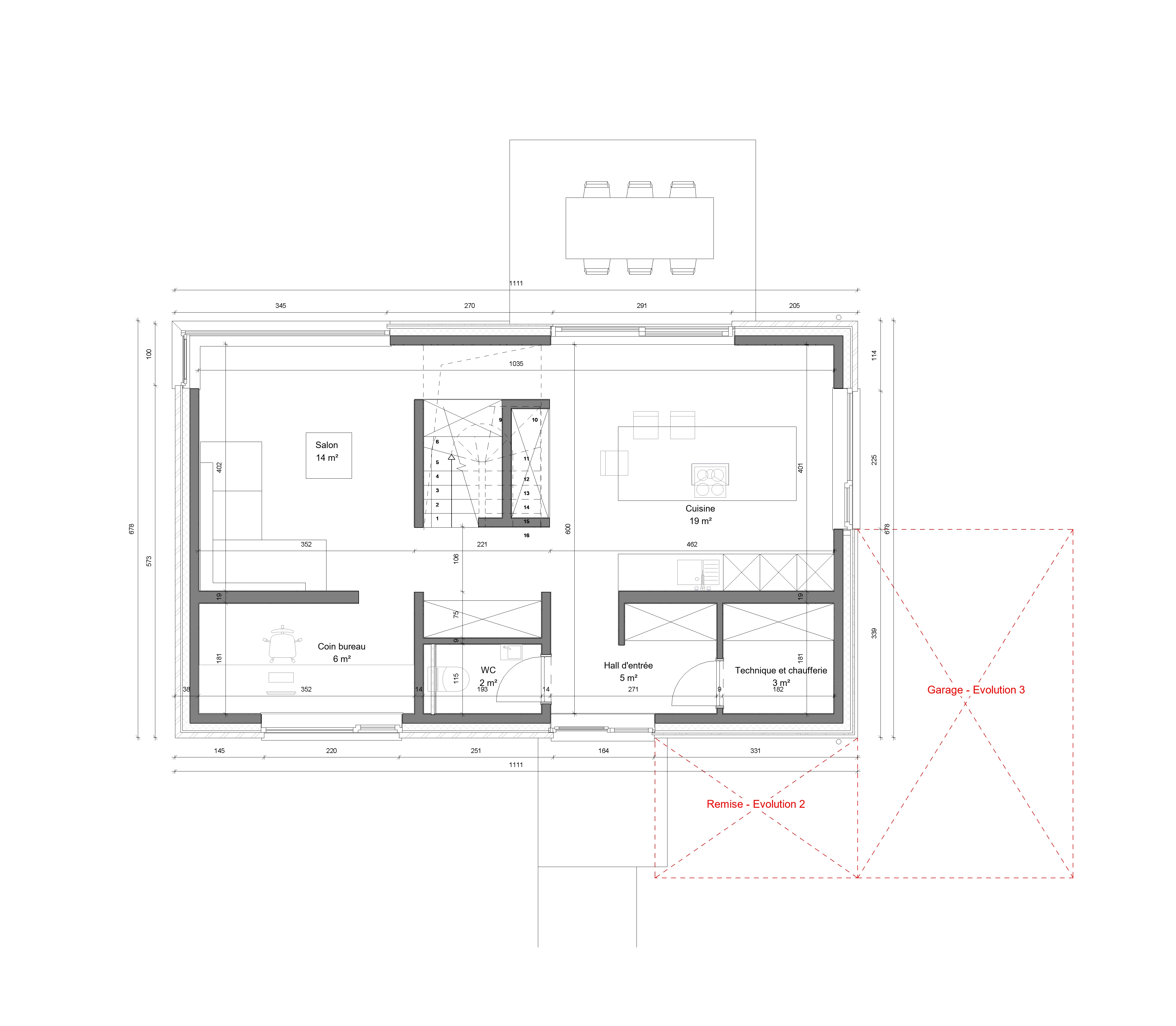 Cette maison inspirationnelle fait 75m2 au sol. La prouesse technique de Philippe a été d’y aménager des espaces fonctionnels, agréables. Tout le confort se retrouve dans cette maison compacte. Et si on souhaite l’agrandir ? Le bureau a pensé à deux évolutions, l’ajout d’une remise et d’un garage. Signe des temps, la mobilité douce fait de plus en plus partie de la vie de famille. Une remise pour y entreposer vélos, trottinettes devient un espace indispensable.